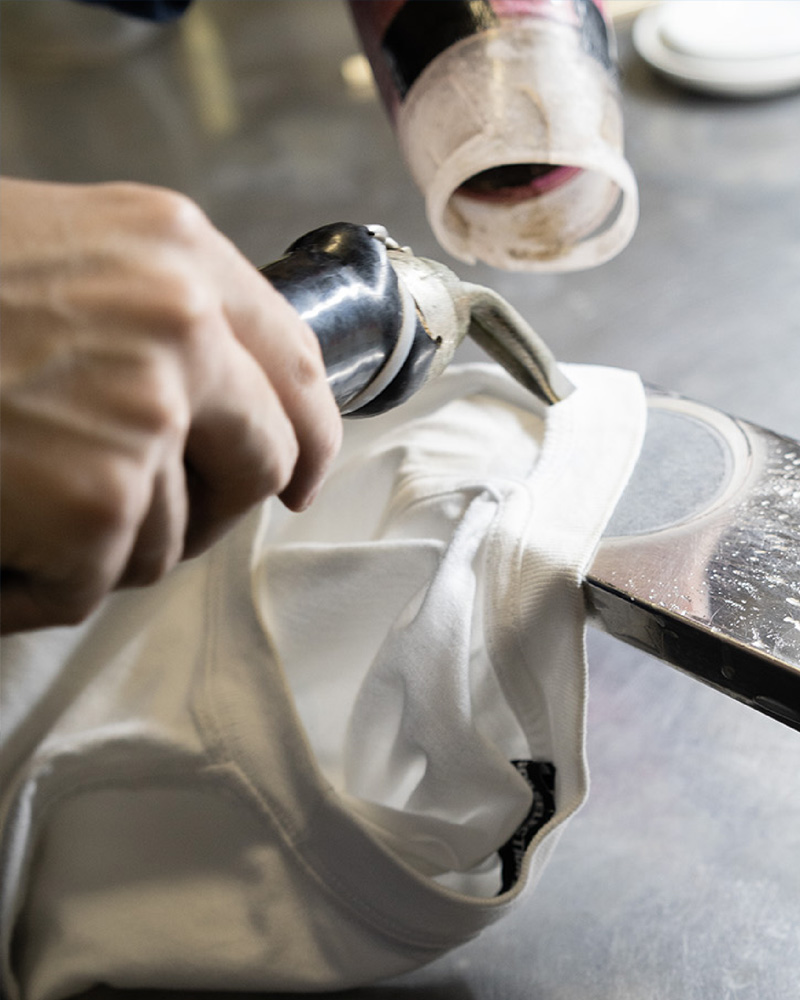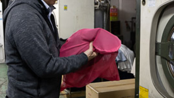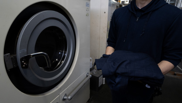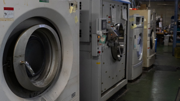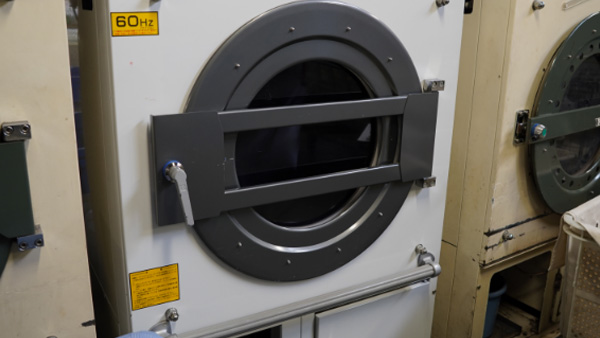 ドライクリーニングの洗浄液は乾燥機により80%以上回収し、新液に蒸留後再生しています。